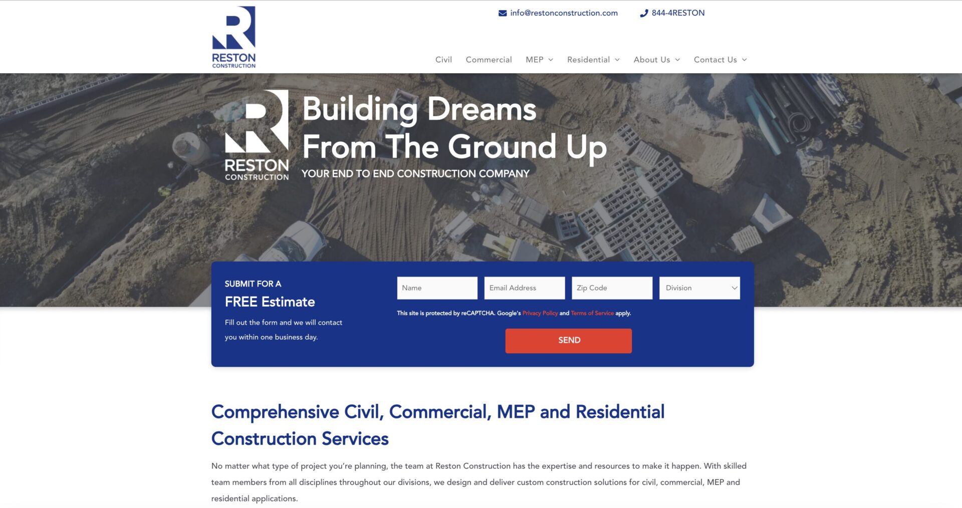 Headquartered in Washington, D.C., Reston Construction has been in business for over 50 years. They offer full-service general contracting across civil, commercial, MEP, and residential sectors. Their family-owned business and local labor force demonstrate a commitment to community and craftsmanship. Reston launched a brand new website in 2025 that highlights each of their several divisions’ expertise.